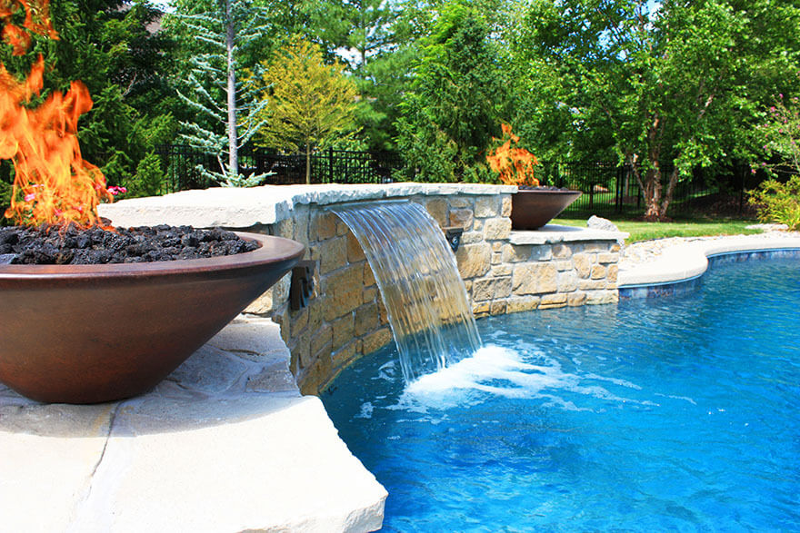 Pool waterfalls with fire effect